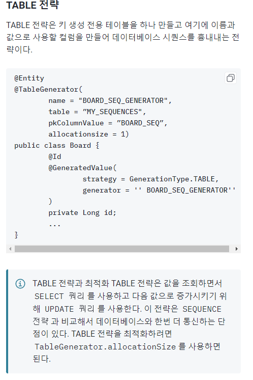 - TABLE : 데베 시퀀스 생성용 테이블에서 식별자 값을 획득한 후 영속성 컨텍스트에 저장한다.
