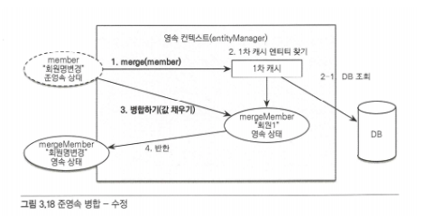 - 식별자 값으로 엔티티를 조회할 수 있으면 불러서 병합하고 조회할 수 없으면 새로 생성해서 병합한다. 따라서 병합은 save or update 기능을 수행한다.
