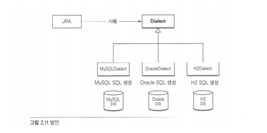 개발자는 JPA가 제공하는 표준 문법에 맞추어 JPA를 사용하면 되고, 특정 데베에 의존적인 SQL은 데베 방언이 처리한다.